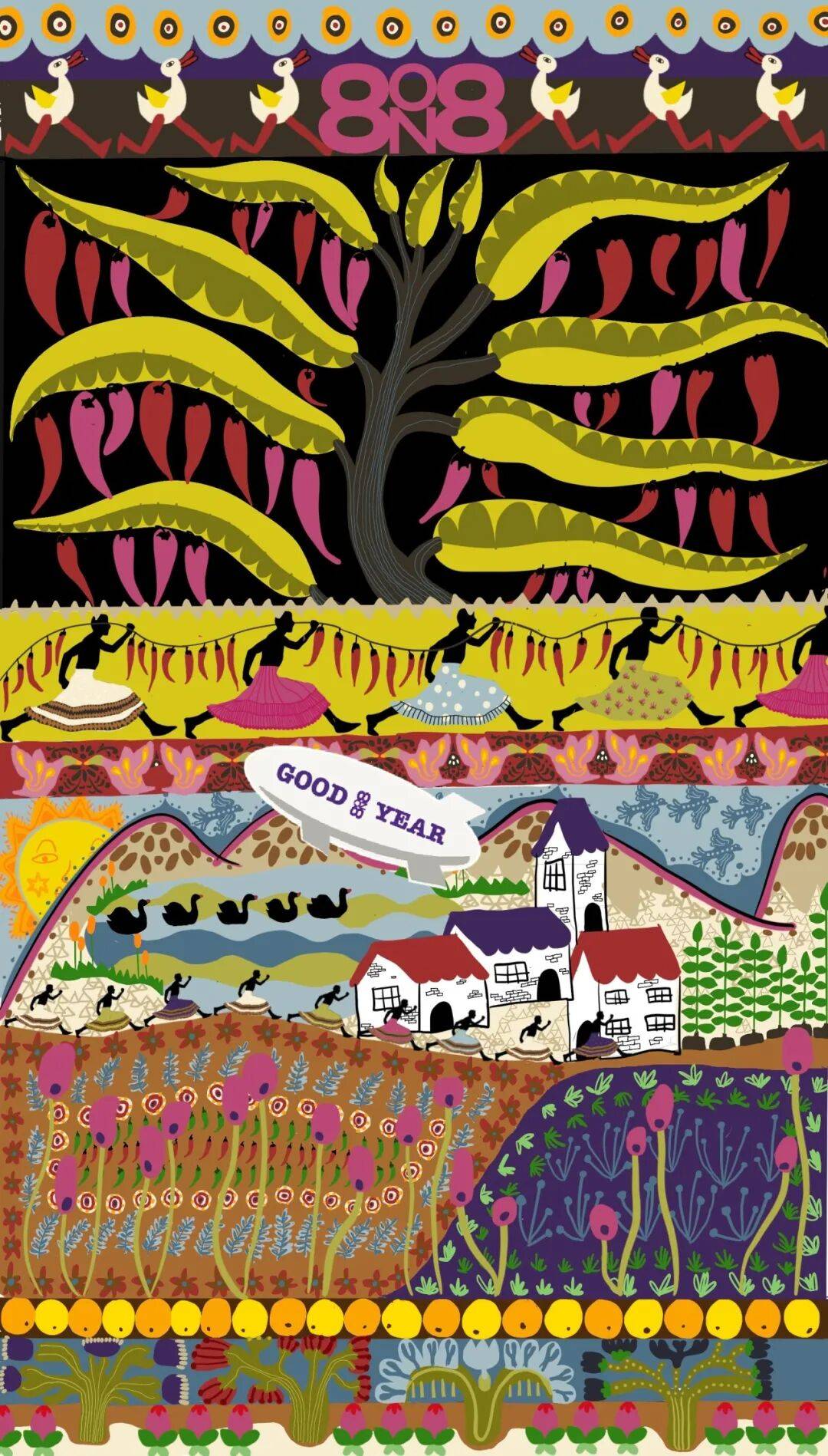 “一座天外来物莫名降落在高楼耸立的城市上空,恰似一片超体培育的世外桃源。村屋,花田,巨大瓜果,天鹅和奔跑的人群不成比例,飞艇盘旋于高空,拔地而起的巨型辣椒树如有神力般庇护着笼罩的一切。刹那间城市高楼,大树,村屋,以及田野中的一切混错,这天花乱坠的荒谬世界看似惊险四起,却又欣欣向荣,热烈和谐。”