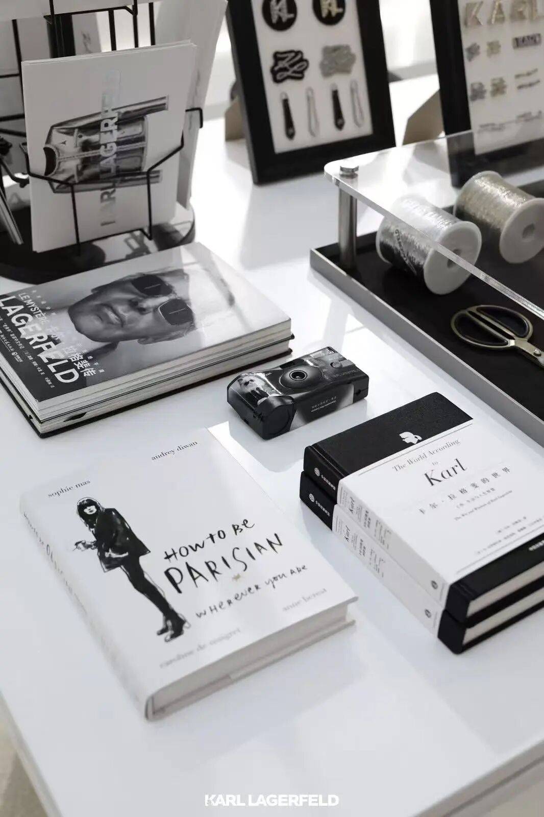 KARL LAGERFELD「未来之境」快闪空间围绕三大核心区域铺陈开来,立体诠释品牌美学积淀、知识疆域与创意精神。经典粗花呢典藏回廊以品牌标志元素串联过去与未来;IKONIK系列展区汲取LIBRAIRIE 7L图书馆灵感,书香氤氲间折射出创始人的博学睿智;创作工作室还原灵感迸发的工作场域,揭秘创意源点。