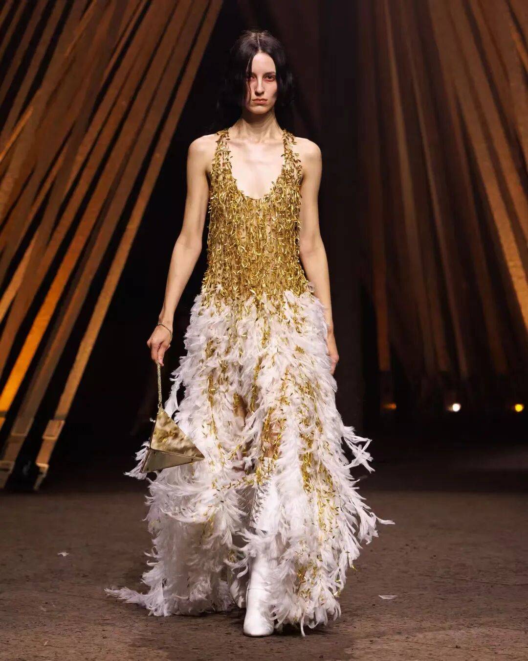 系列从电影《异教徒》中汲取张力,将军官制服拆解重构,以摩登视角再现McQueen标志性的锐利剪裁:解构外套、错位贴袋与切割紧身胸衣,皆根植于品牌精湛的裁艺传统。随着叙事迈向释放,抽象昆虫印花跃上真丝礼裙,烧焦喷漆、火焰装饰与多层雪纺堆叠出燃烧般的卷须形态,仿佛潜意识欲望彻底迸发,在都市与自然之间完成一场本能游走。