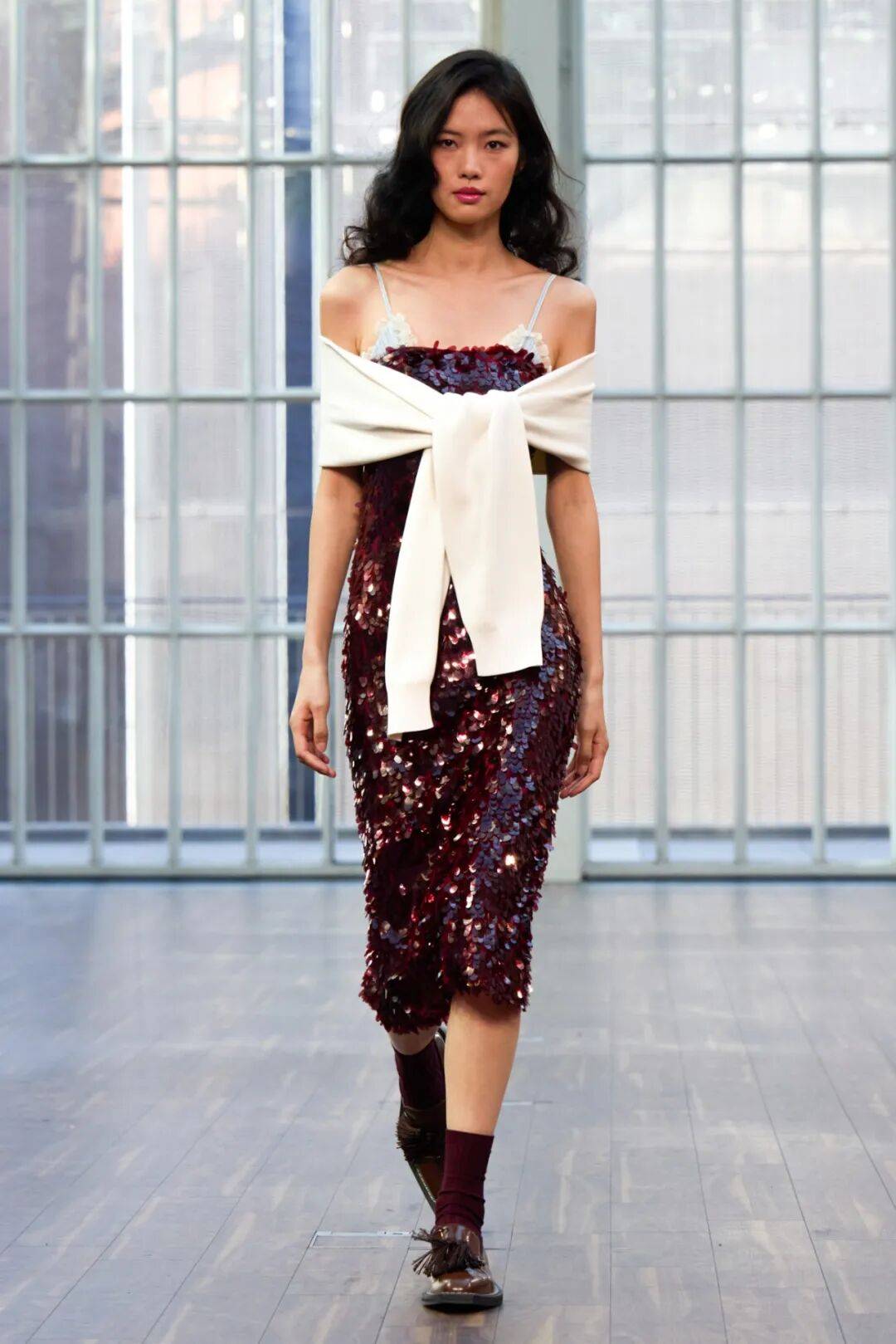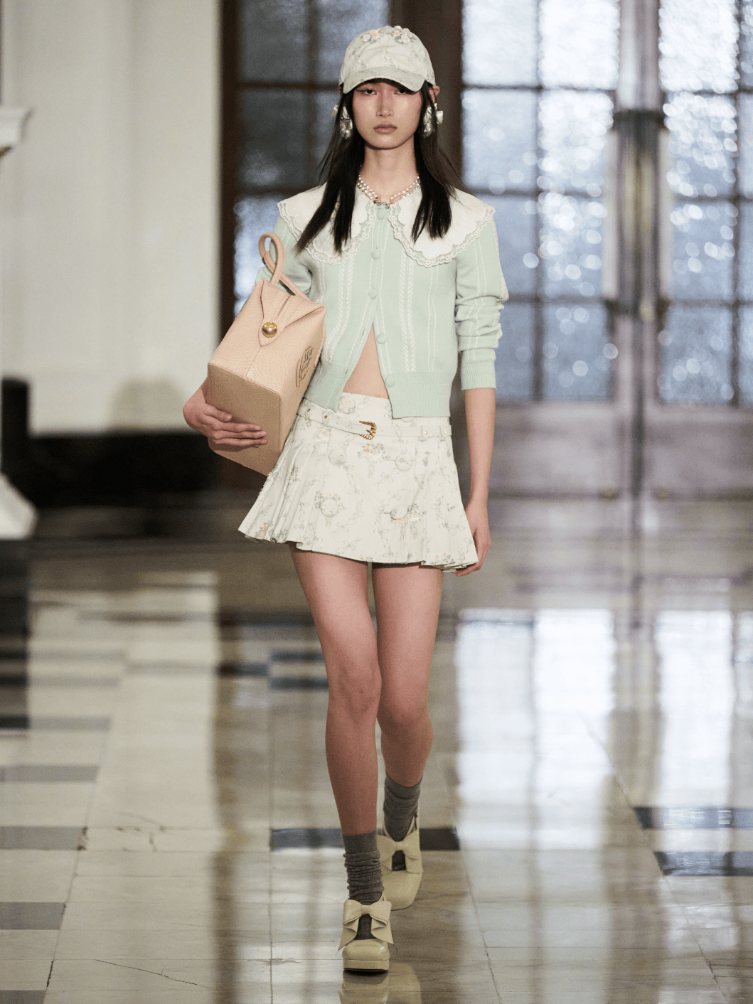 品牌将象征80年代伦敦名门闺秀的Sloane Ranger穿搭以摩登手法重释:橄榄球衫叠穿挺括衬衫,亮片与棉质条纹的大胆组合,经典的麻花针织覆于羊毛丝质套装之上。赛马绿、巧克力棕、婴儿蓝与薰衣草色,共同勾勒出乡村与都市的平衡之美。