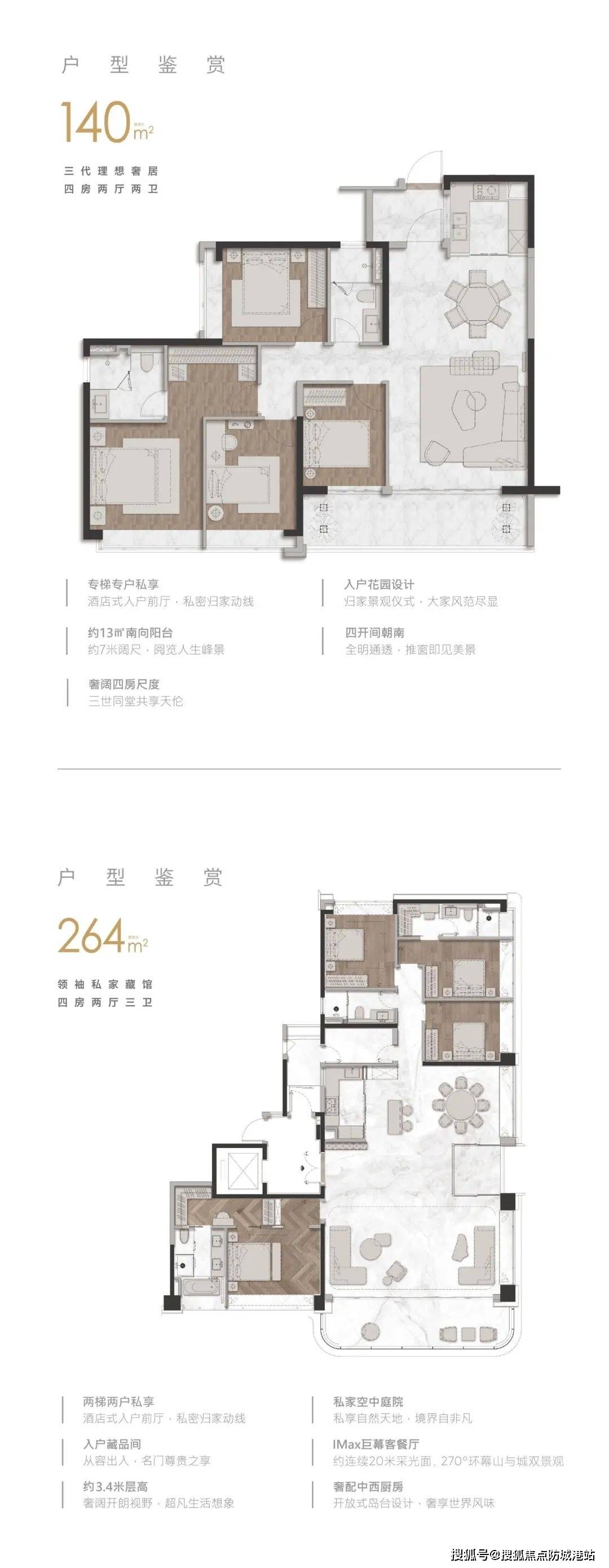主力户型:建面约140-264㎡四房大平层(270°IMAX环幕观景设计,得房率超85%)