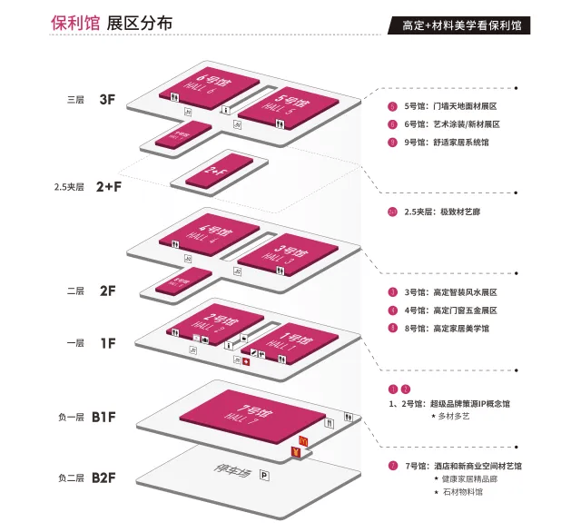 广州保利世贸博览馆(保利馆)集中展出适于私宅与新商业空间的:高定系统家居、高定系统门窗、厨房和卫浴、智装风水系统涵盖的空调/新风/供暖/除尘/水处理/热水太阳能/空气能等以及隐蔽工程涉及的给排水工程管材/阀门、电器管线、地板/护墙板/门窗套板/吊顶基层材料和技术服务等;和全屋整装相关产品、技术与服务,包括各类集成定制品、墙体装饰、涂装、门、窗、遮阳、五金、设备与解决方案等;以及建筑室内外装饰工程中适用的相关天花、地面、墙面、声学、光影、电工的各类新型装饰与装修材料及产品。