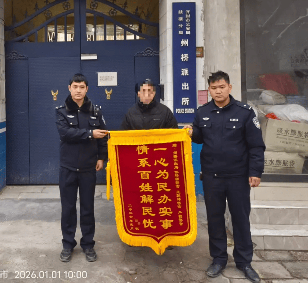 成都游客徐女士在万岁山景区丢失手机后,北郊派出所民警周玉开连夜查看监控锁定特征。1月1日凌晨3点,他根据手机定位找到辖区某民宿,面对捡拾者最初的否认,他耐心沟通、细致工作,最终让手机平安回到徐女士手中。“开封公安是为人民保驾护航的守护者!”徐女士的锦旗上那句“我相信人民警察”,是对这份执着最好的回应。