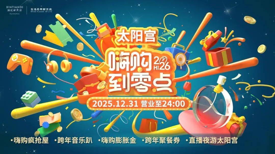 2025年12月31日,瑞虹新天地太阳宫将延时营业至24:00,并以“嗨购到零点”为主题,打造一场集嗨购、限时挑战、音乐趴、云直播于一体的沉浸式跨年狂欢体验。活动从当晚19:00持续至24:00,引爆跨年之夜。