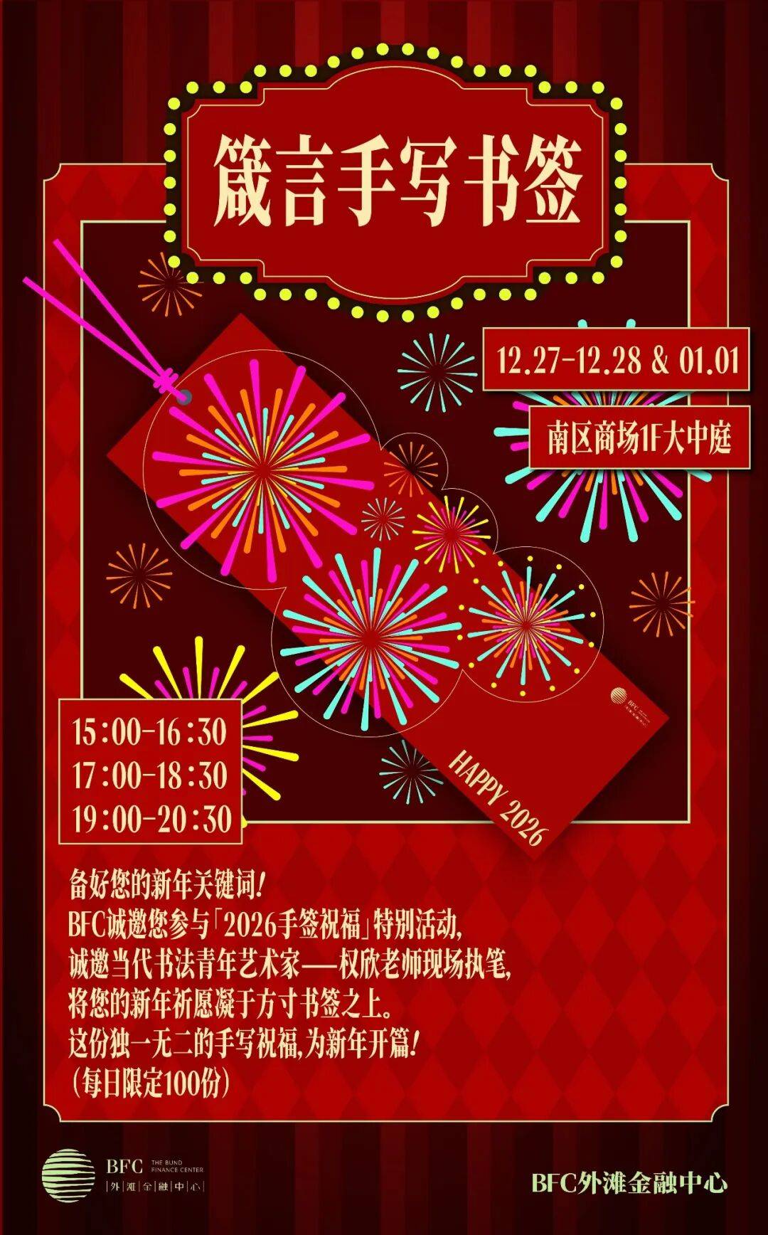 12月31日及1月1日,欢迎参与「手作新年烟火计划」,亲手制作独一无二的毛绒烟花棒,用温暖手工点亮新年第一束光!1月1日「2026手签祝福」特别活动也将温情开启,书法艺术家权欣老师将亲临现场,为你手写定制新年书签,将美好祈愿凝于方寸之间。