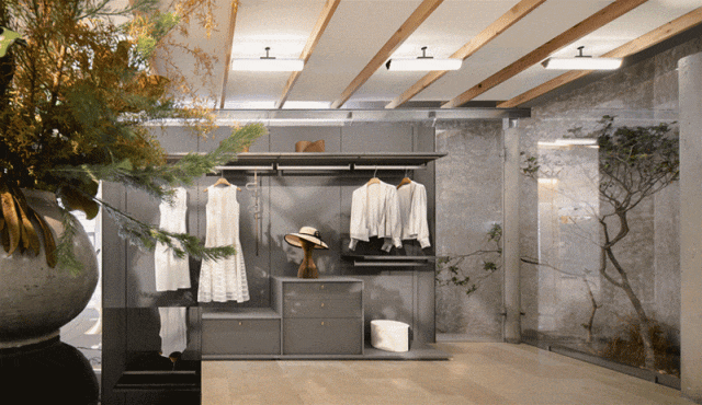 店铺空间在整体的深沉木色中融入自然绿意。绿色透亮的玻璃门为香氛衣柜增添温柔气息,弧形设计则柔化了木质高墙的纵深感。尽管位于商场之中,面向室外的入口欢迎着每一位过路人。通过开阔的玻璃幕墙,自然光线与四周风景一并映入眼帘,延续着西湖的流动气韵。