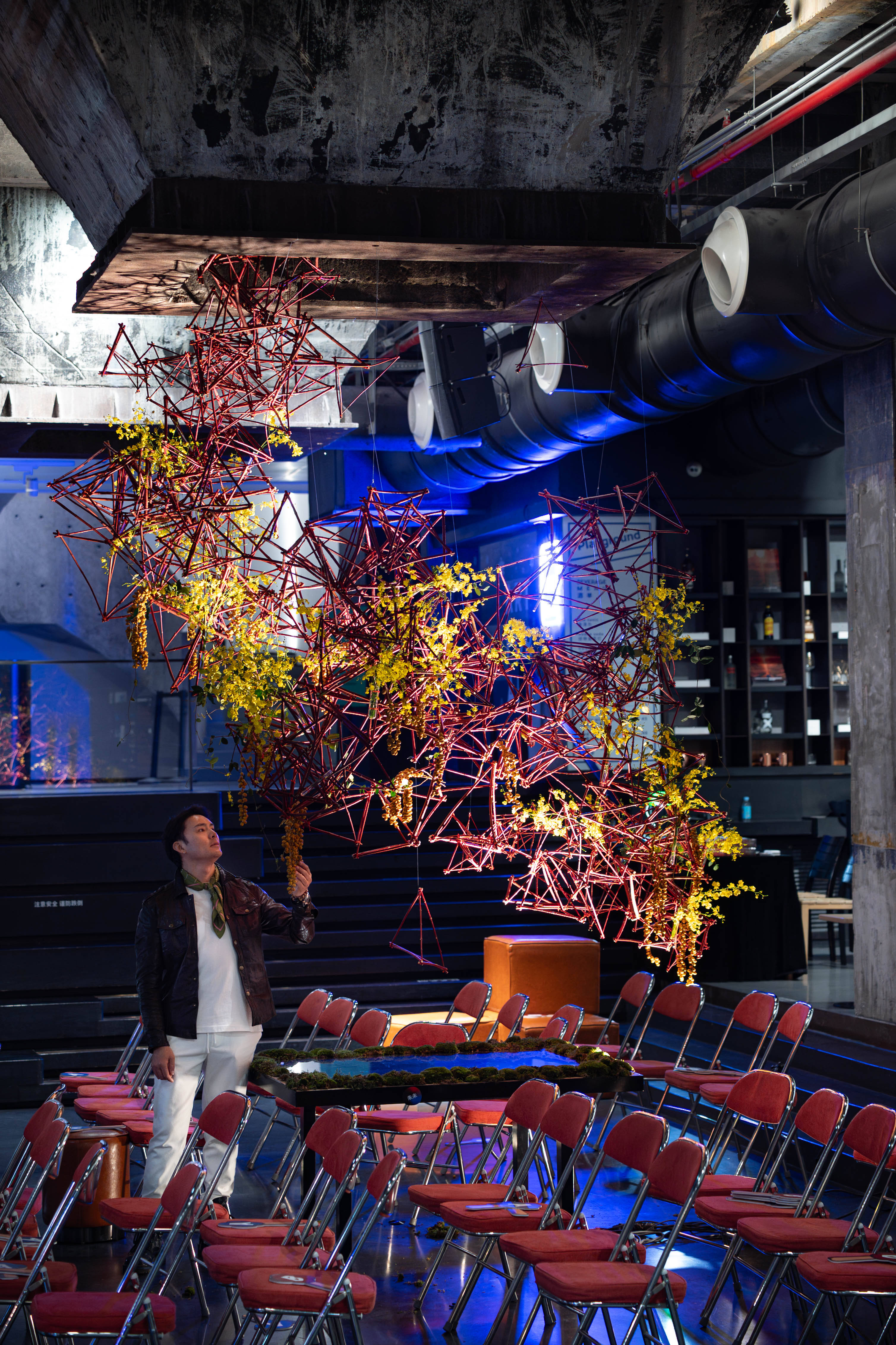 尤为点睛的是,当这份精心雕琢的花艺装置置身于美术馆偏暗的工业风环境中时,藤条的立体架构、花材的细腻层次皆悄然隐匿,原本暗藏的张力也未能得以充分彰显。这一幕被Jack敏锐捕捉,他当即提出补光需求,一束精准光束瞬间穿透藤条架构,将宝石红藤条的肌理、金合欢的明丽尽数点亮。光影交错间,静态装置焕发出动态韵律,让“破界”的视觉表达更具冲击力,成为活动现场备受瞩目的打卡焦点。