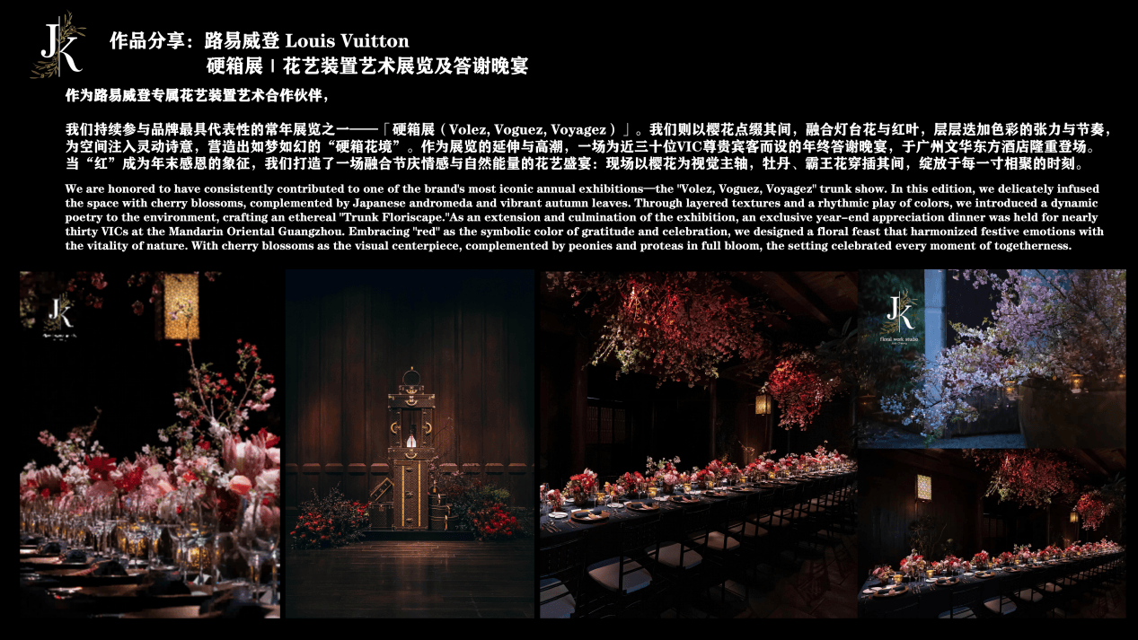 自2017年起,他带领团队仅用48小时便完成了长达六米、高达2.5米的“沙漠之眼”花艺雕塑,这一壮举颠覆了大众对花艺的传统认知。他又为路易威登硬箱展精心打造了“硬箱花境”,为戴比尔斯高珠晚宴构建了梦幻般的“宝石森林”。他以突破想象的创作,深刻展现了花艺作为空间叙事媒介的无限多元可能。