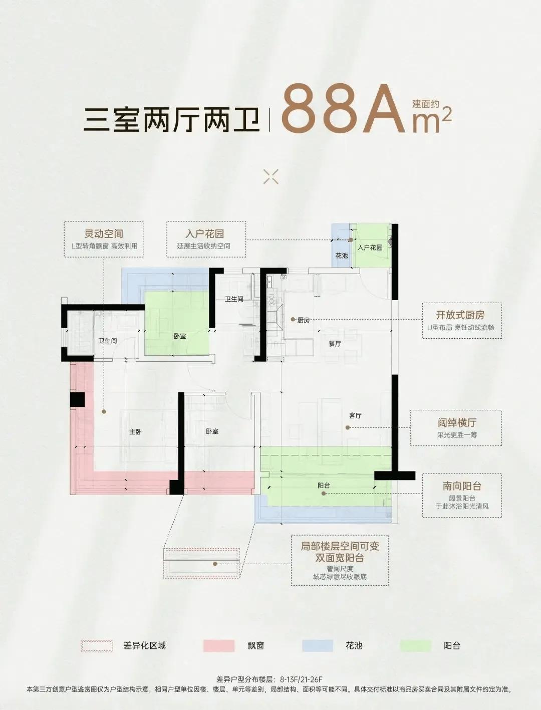 作为项目的热销户型,这个户型的设计亮点十足。拥有7.3米通铺阳台,直接连接次卧,不仅拓展了室内的采光和通风面,让房间更加通透明亮,还能作为休闲观景、晾晒衣物的多功能空间。主卧带270°转角飘窗,躺在床上就能欣赏到窗外的美景,视野开阔,私密性也更强。合理的空间布局,让每个房间都拥有舒适的居住尺度,无论是三口之家还是三代同堂的过渡居住,都能轻松胜任。