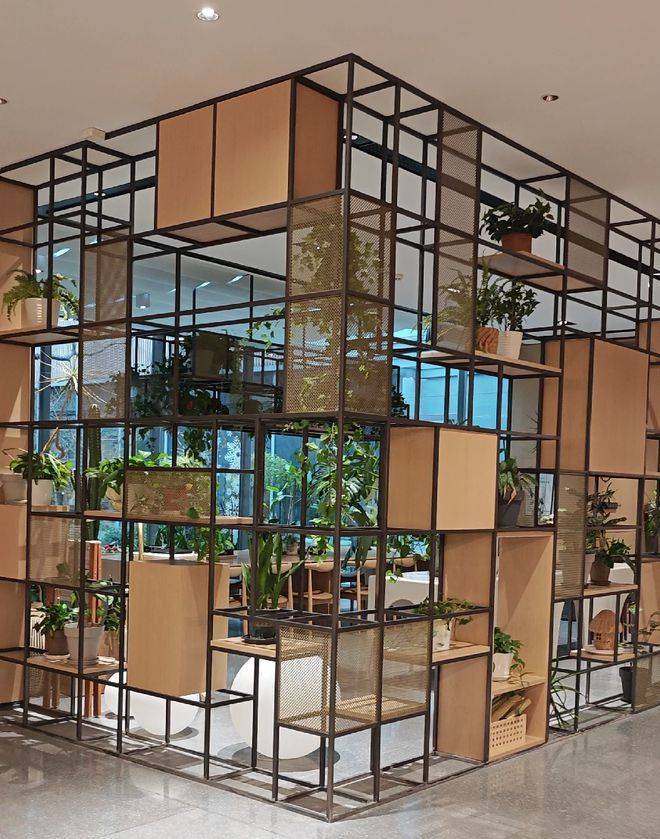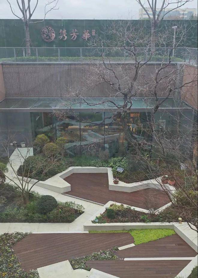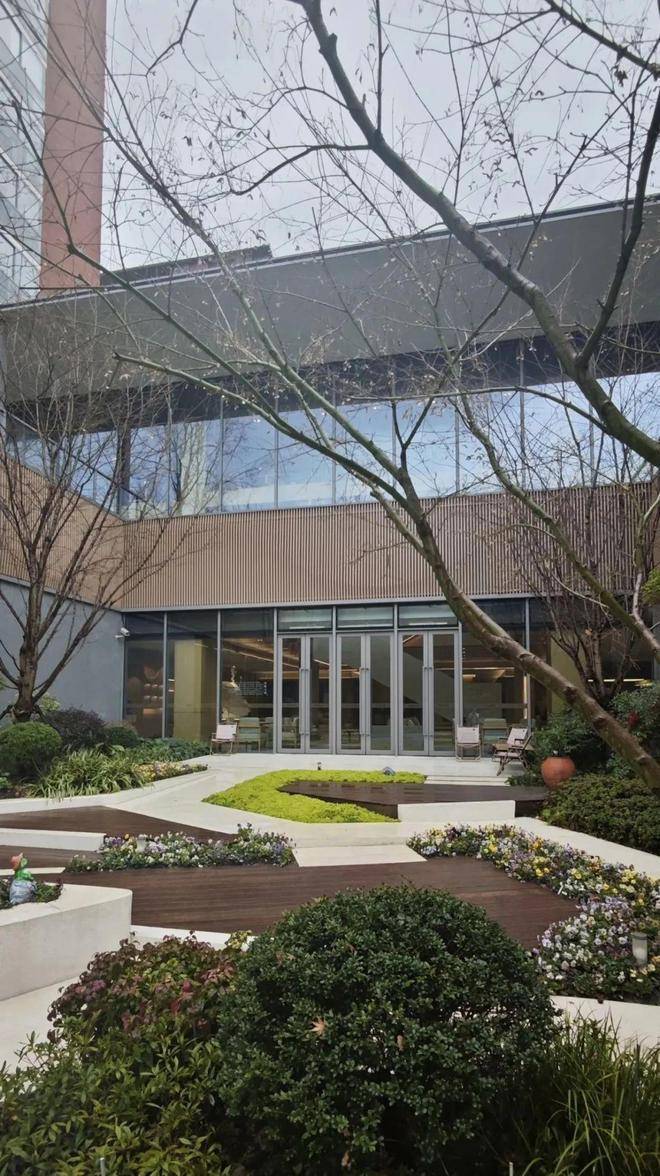 一颗乌桕树以合抱之姿立于其中,低矮的灌木和各色花卉正值盛放,植物配合的相得益彰。不管是室内还是室外,都能感受庭院的宁静和雅致自然气息。