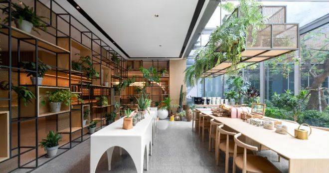 花艺工坊中,植物郁郁葱葱,老人们在这里可以学习花艺、与花草为伴,感受自然气息。