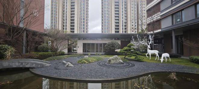 从入口进入,回字型风雨连廊将我们引入会所,沿途新中式风格的庭院景观,让人瞬间心境归于宁静。