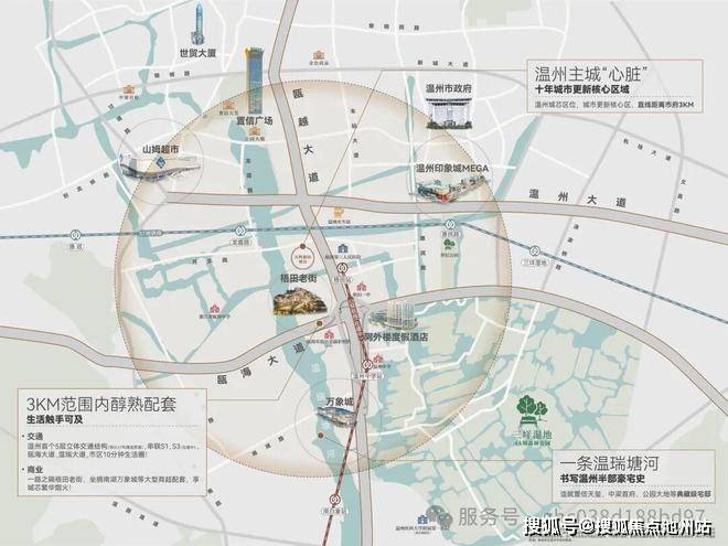 【板块】:温州城芯区位,城市更新核心区,北接鹿城,东临温州豪宅板块中央绿轴,直线KM(数据来源:百度地图)。