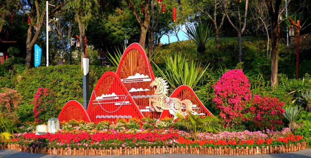 新春逛芝山,赏景纳福正当时!解锁马年满满福气——西门入口广场,金红色飞马搭配“福马贺岁”造型,浓浓的新春气息扑面而来。