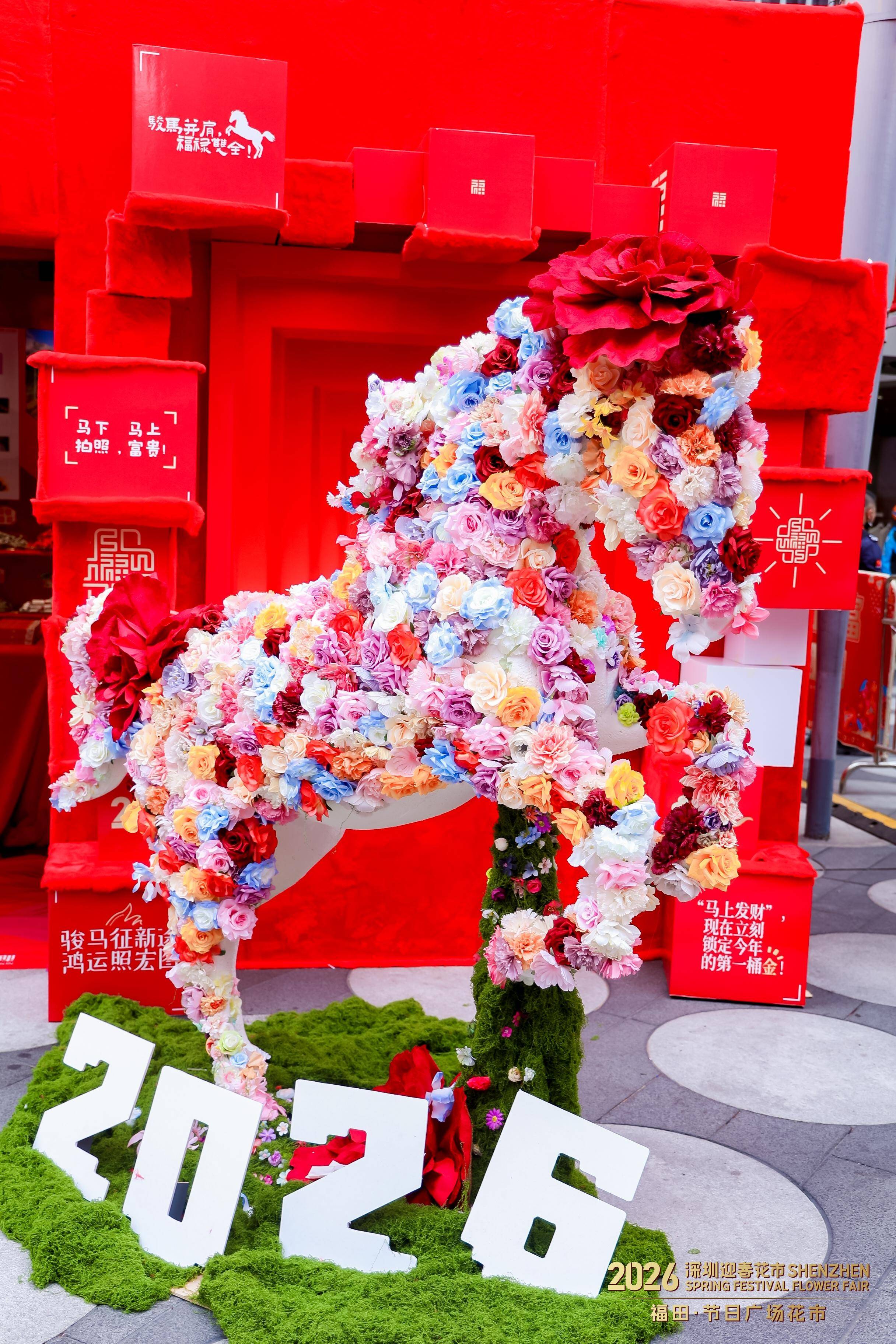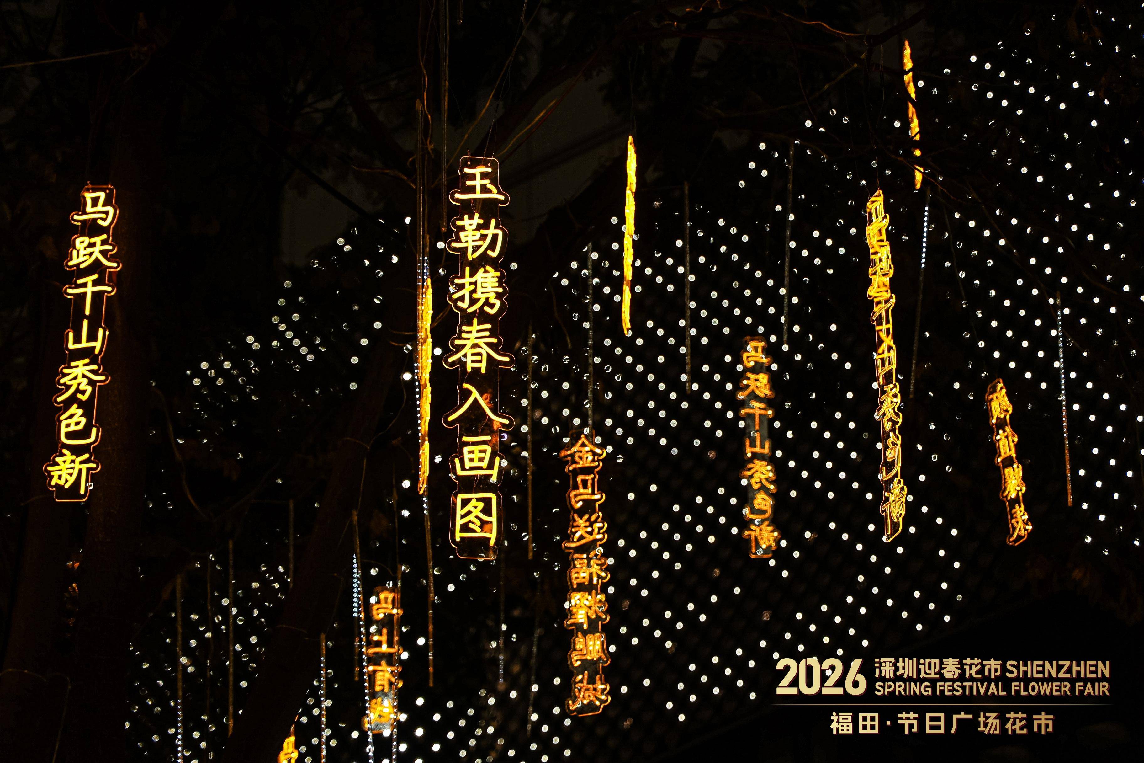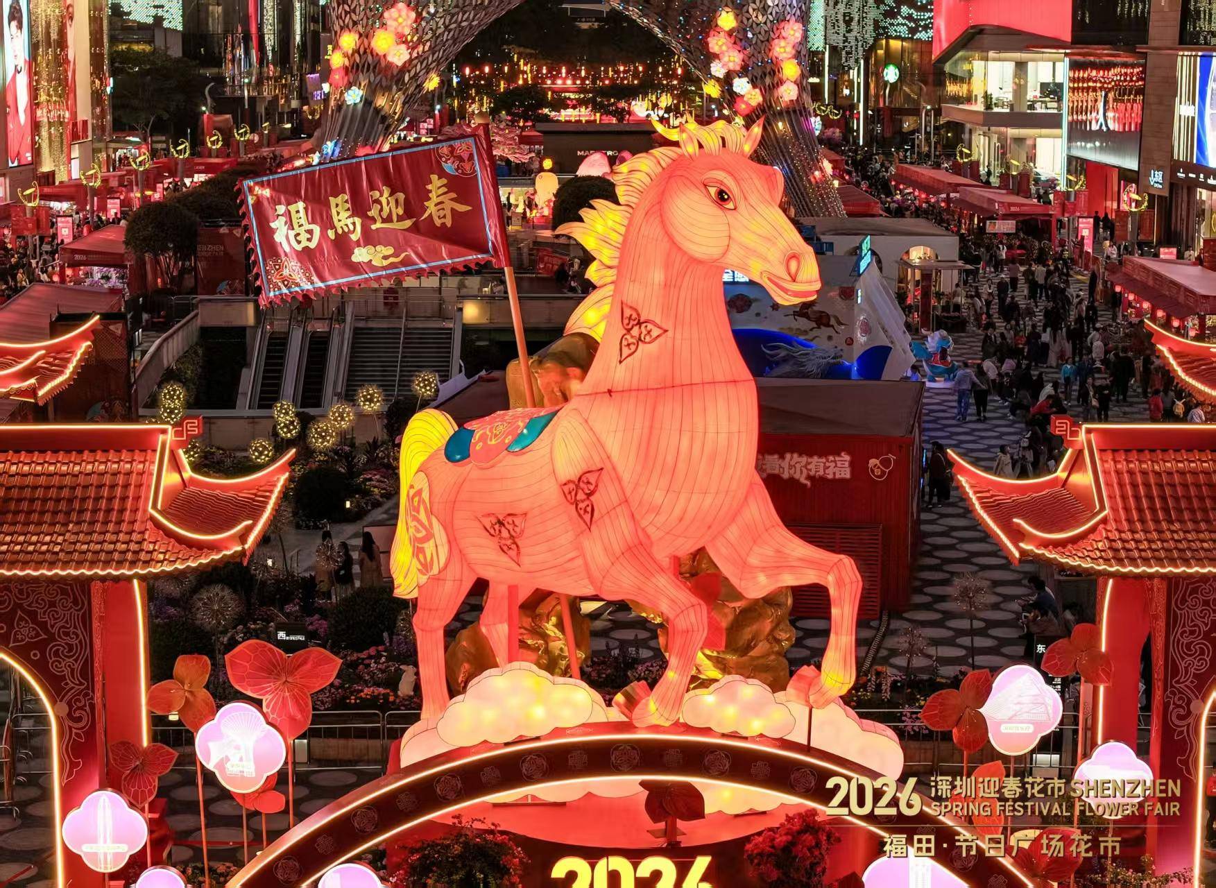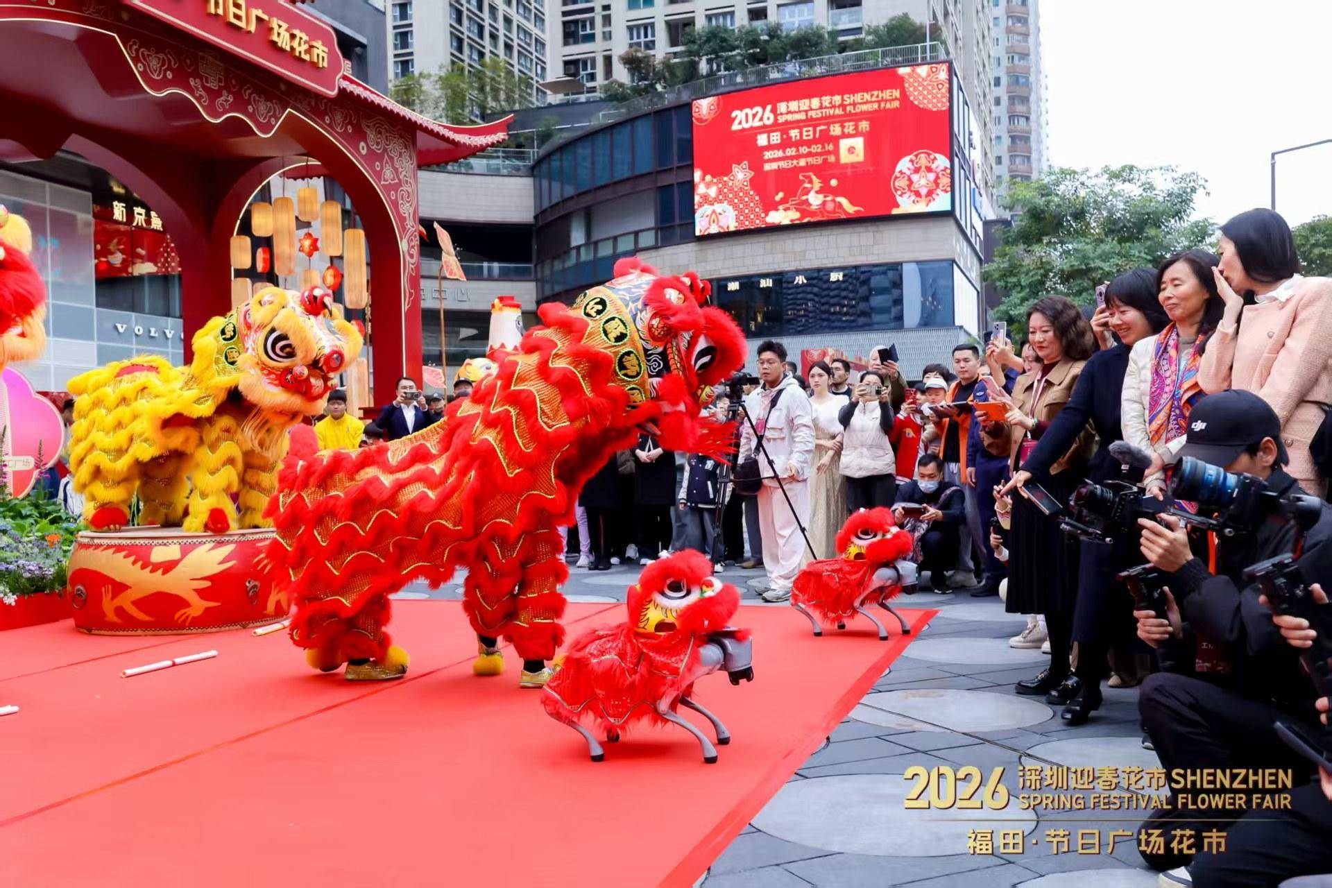 2026福田·节日广场花市首日,街舞演员与宇树机器人带来《火力全开》舞蹈,传统醒狮与“机器狗小狮子”同台表演,形成传统与科技的对话。潮州饶平“布马舞”等非遗项目展开巡游,彩绸“骏马”奔腾于人群之间。由一级书法师、一级美术师杨文才等名家领衔的“挥春送福”活动,为花市增添了文化底蕴。