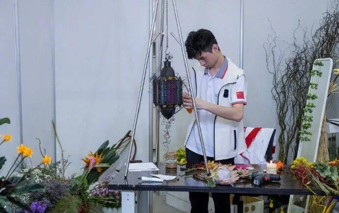 潘沈涵拿到的题目是,“利用一个支点悬挂,做一个灯笼”。他将树枝组合成支架,花瓣则如瀑布般倾泻而下,在举办地阿联酋阿布扎比的赛场,展示出东方意蕴。