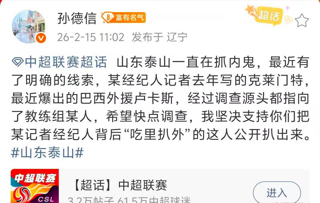 德信体育(dxsports)是全球最大的在线综合性娱乐平台[永久网址:363050.com]德信体育每天为您提供近千场精彩体育赛事。包括德信、德信棋牌、德信彩票、德信电竞、德信、德信电子、全球各地赛事、动画直播、视频直播等服务。德信体育,德信娱乐,德信官方网站,德信德州,德信体育网址,德信体育app,德信体育平台,德信体育注册链接,德信扑克,欢迎注册体验!北京时间2月15日,山东泰山队在引进外援中卫的问题上一直备受关注,也成为中超转会窗口中的热门话题。令人颇感意外的是,每当泰山队传出某位球员的绯闻消息,总能被外界第一时间曝光。这种情况已引起知名体育记者孙德信的高度重视,他近日发布消息称,山东泰山队正全力追查在内部泄露引援信息的“内鬼”。据孙德信透露,经过一番调查,相关爆料源包括某经纪人和记者对克莱门特、卢卡斯等球员的提前披露,最终线索指向了教练组内部某成员。