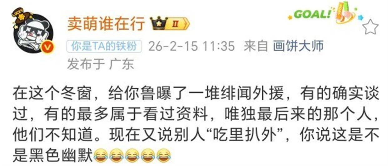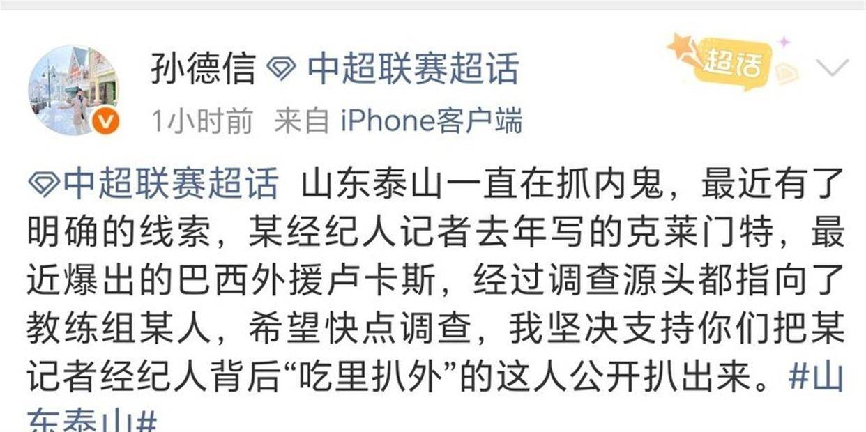 值得注意的是,那位频繁被提及的媒体人孙德信,在此事中扮演的角色颇为关键。 作为泰山队的铁杆支持者,他向来以敢说敢写著称。 最近他在多个场合暗示俱乐部内部存在“信息黑洞”,并称已有实质性进展。 虽然他没有点名道姓,但字里行间透露出对某些“吃里扒外”行为的不满。 他的言论很快引发圈内热议,不少人猜测,他之所以能掌握这么多细节,或许正是因为即将入职俱乐部宣传岗,提前参与了相关沟通。