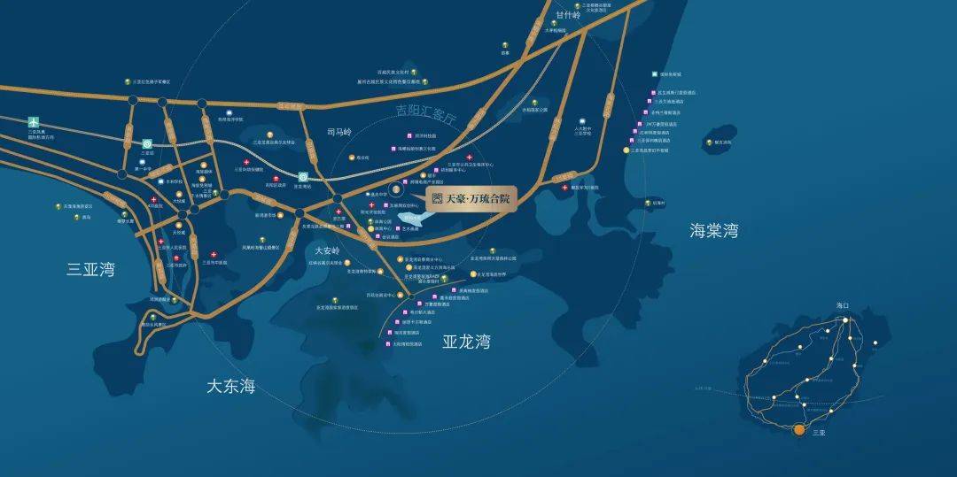 万琉合院,位于吉阳区政府规划“吉阳汇客厅”的核芯,将亚龙湾度假组团、鹿回头景区组团等多点汇聚形成合力,通过亚龙湾南站打造站城一体的E-TOD,成为集交通站点、科创办公、金融中心、特色商业、文创集市、艺术休闲、生态居住、服务配套等功能为一体的城市客厅。